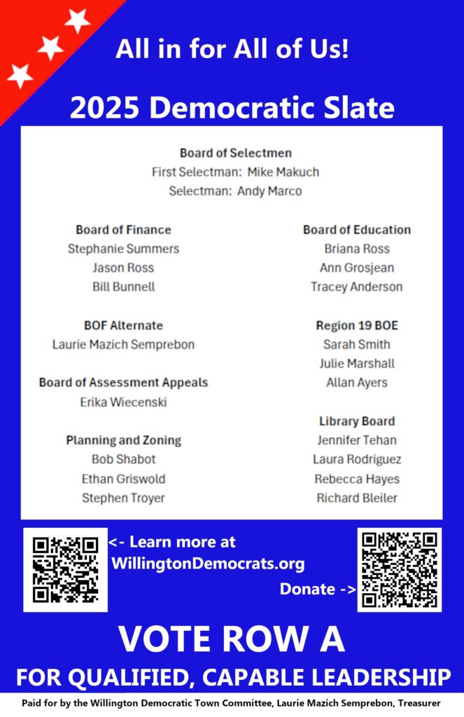 The Willington Democratic Town Committee is an elected body that represents the town’s registered Democrats. Our DTC is responsible for identifying, endorsing, and helping to elect Democratic candidates from Willlington town hall to the gold dome of the State Capitol, all the way to Congress and the White House. All politics is local and it starts with us.
