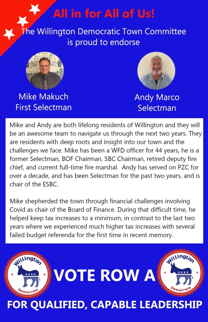 The Willington Democratic Town Committee is proud to endorse Mike Makuch for First Selectman!